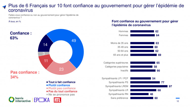 Mais 63 % des Français font confiance au gouvernement. On observe ici une plus forte disparité en fonction de l'appartenance partisane, puisqu'ils ne sont que 48 % des sympathisants du Rassemblement national et 54 % des sympathisants de l'extrême-gauche.