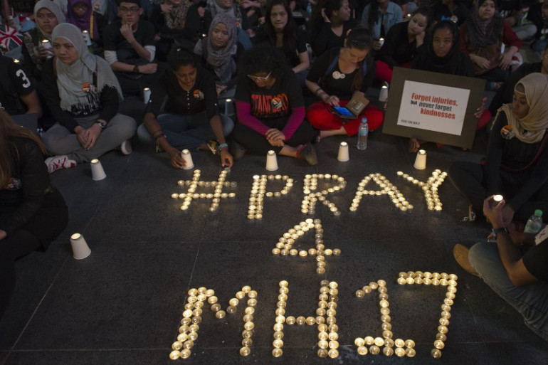 Des habitants de Kuala Lumpur participent à une veillée en hommage aux victimes du crash d'un avion de la Malaysia Airlines, le 18 juillet 2014