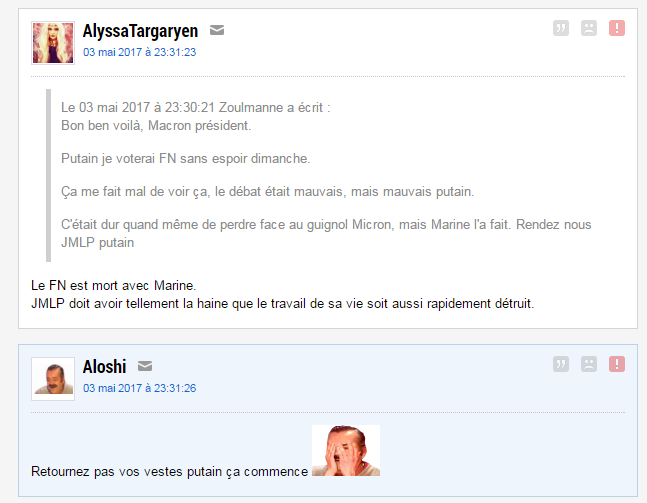 En parallèle, comme l'a repéré le Huff Post et plusieurs internautes sur les réseaux sociaux, bon nombre de militants frontistes n'ont pas caché leur déception et leur frustration au cours de cette émission de deux heures et demi. Ces regrets ont pu être constatés au sein de la "Taverne des Patriotes", l'un des serveurs Discord (une plateforme de discussion en ligne) fréquentés par les électeurs d'extrême droite. "Faut qu'elle arrête de jeter la faute sur Macron", disait au bout d'une trentaine de minutes un internaute quelque peu irrité par la succession d'attaques personnelles. Des messages similaires pouvaient aussi être lus sur le forum Blabla 18-25 ans de jeuxvideo.com, repaire de nombreux jeunes électeurs du Front national.
