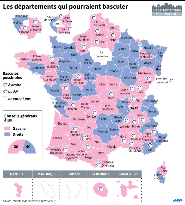 La gauche, qui avait atteint son point le plus haut en 2011 (elle dirige aujourd'hui 61 départements) ne semble pas en mesure d'en gagner un seul. Et pour la première fois, le FN peut se retrouver majoritaire dans une poignée de conseils généraux.