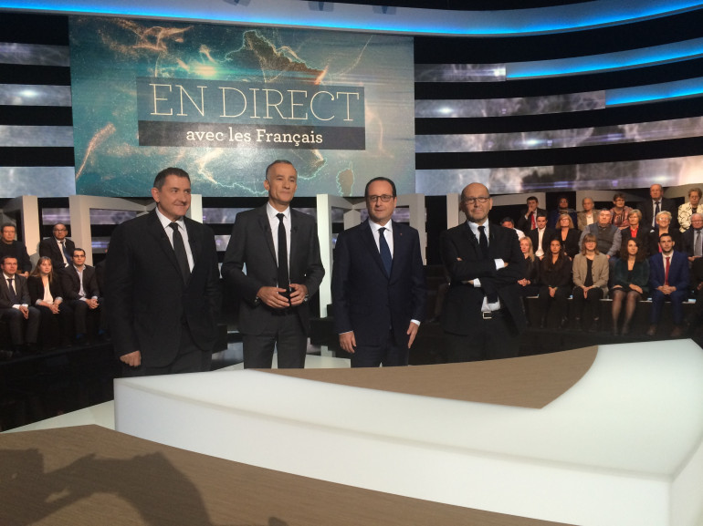 20h15 : Yves Calvi, Gilles Bouleau, François Hollande, et Thierry Demaizière sont prêts pour l'émission spéciale qui démarre dans 15 minutes.