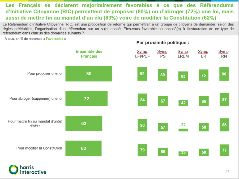 Ainsi, 80% des personnes interrogées se disent favorables à ce type de référendum pour proposer une loi, 72% pour abroger une loi, 63% pour mettre fin au mandat d’un élu, et même 62% pour modifier la Constitution.