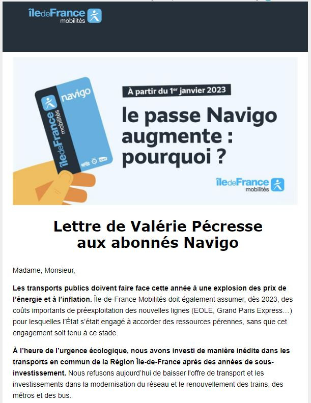 Dans son message, la présidente d'Île-de-France Mobilités (IDFM), autorité organisatrice des transports dans la région francilienne, justifie cette hausse d'une dizaine d'euros par "une explosion des prix de l'énergie" et en raison de "l'inflation".