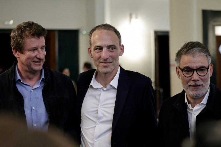 Yannick Jadot, Raphaël Glucksmann et Olivier Faure, lors d'une table ronde à Montreuil, le 11 avril 2026.