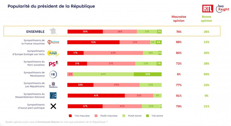 Dix jours après avoir annoncé la dissolution de l'Assemblée nationale, la popularité d’Emmanuel Macron accuse le coup. Selon notre sondage BVA Xsight pour RTL, seuls 26 % des Français déclarent avoir une bonne opinion de lui (-6 points en un mois), contre 74% (+6) qui en ont une mauvaise opinion.