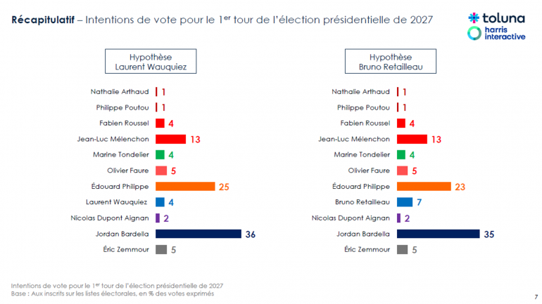 Dans le cas où Laurent Wauquiez représenterait les LR, Jordan Bardella recueillerait 36% des voix, suivi d'Édouard Philippe avec 25% des intentions de vote, puis Jean-Luc Mélenchon qui est crédité de 13%.