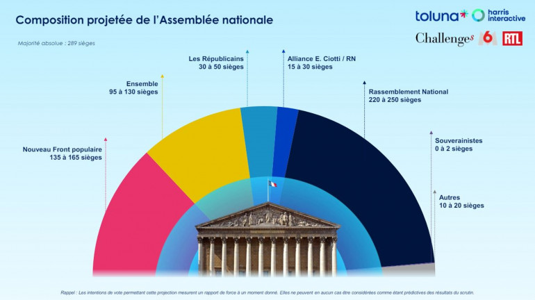 Le rapport de force est clairement en faveur du RN avec 33 % des intentions de vote. Mais en sièges, le RN et ses alliés obtiendraient entre 235 sièges, hypothèse basse, et 282 sièges, hypothèse haute, dont 15 à 30 pour Éric Ciotti et ses amis. La progression est spectaculaire : dans l'Assemblée sortante, le RN comptait 88 députés. Mais le RN rate de peu la majorité absolue puisqu'il faut 289 sièges.