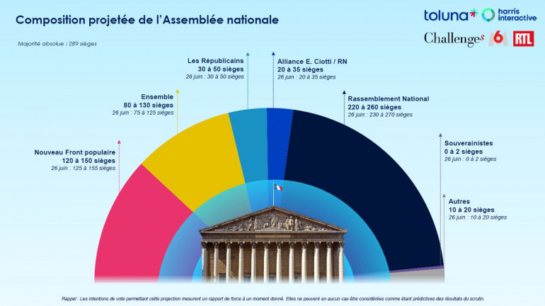 Selon notre sondage Toluna Harris Interactive pour RTL, M6 et Challenges, publié ce vendredi 28 juin, le Rassemblement national de Marine Le Pen et Jordan Bardella reste en tête. Son score reste stable d'après les experts de l'institut de sondage qui porte à 34% les intentions de vote des électeurs pour le RN. En nombre de sièges, cela signifierait entre 220 et 260 députés du RN, présents dans l'hémicycle, d'après cette projection. Le Rassemblement national semble incapable de se porter seul au pouvoir, mais il pourrait bénéficier d'une alliance avec les candidats d'Éric Ciotti qui pourraient remporter entre 20 et 35 sièges d'après cette étude (3% d'intentions de vote).