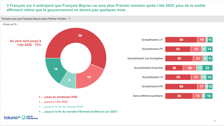 Le nouveau locataire de Matignon passera-t-il l'été ? Selon un sondage Toluna Harris Interactive pour RTL publié ce jeudi 2 janvier 2025, trois quarts des Français pensent que François Bayrou ne sera plus Premier ministre après. Plus de la moitié affirme même que le gouvernement ne durera que quelques mois : ils sont 56% à penser que le gouvernement ne durera que jusqu'au printemps.