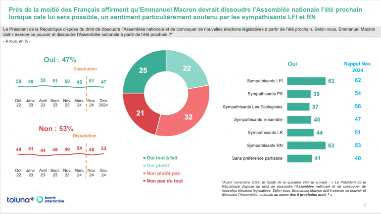 Près de la moitié des Français assurent également qu'Emmanuel Macron devrait dissoudre l'Assemblée l'été prochain. Ce sentiment est particulièrement soutenu (63%) chez les sympathisants de la France insoumise ainsi que chez ceux du Rassemblement national.