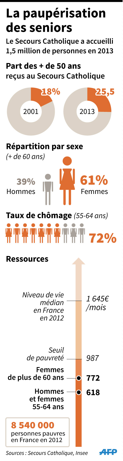 La paupérisation des seniors s'accroît en France. C'est ce que révèle ce jeudi un rapport du Secours catholique. Les plus de 50 ans représentent 25,5% des personnes accueillies par l'association, contre 18% en 2001. Ce sont surtout des femmes, dont le revenu moyen est de 772 euros, soit en dessous du seuil de pauvreté.