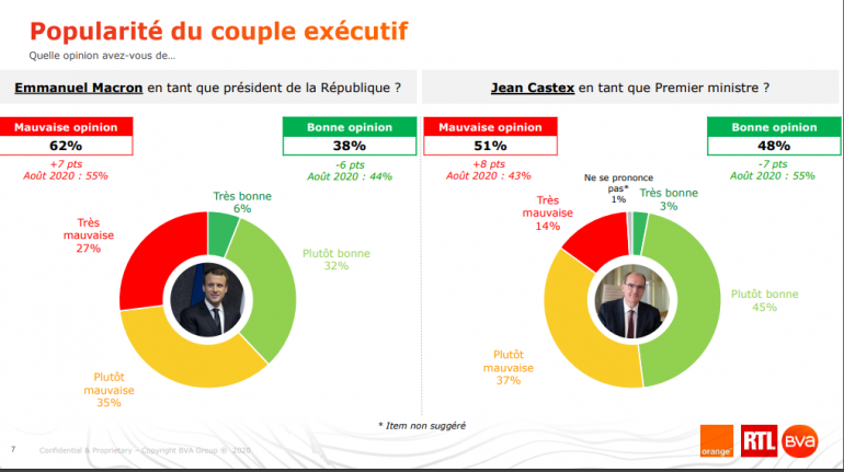 L'état de grâce, c'est fini : la majorité des Français a désormais une mauvaise opinion de Jean Castex, selon un sondage BVA pour RTL et Orange réalisé du 23 au 24 septembre 2020.