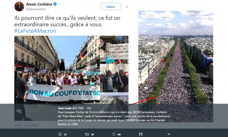 Sur Twitter, Alexis Corbière s'est réjoui d'une importante participation. Le député de Seine-Saint-Denis a posté plusieurs photos pour montrer l'ampleur de la mobilisation. Mais parmi celles-ci, il a inclut une image datant de... juillet 1998. À l'époque, près de 500.000 Français étaient descendus sur les Champs-Élysée afin de célébrer les Bleus de Zidane, vainqueurs de la Coupe du monde. À noter que "la fête à Macron" reliait l'opéra Garnier à la place de la Bastille, sans passer par la plus belle avenue du monde.