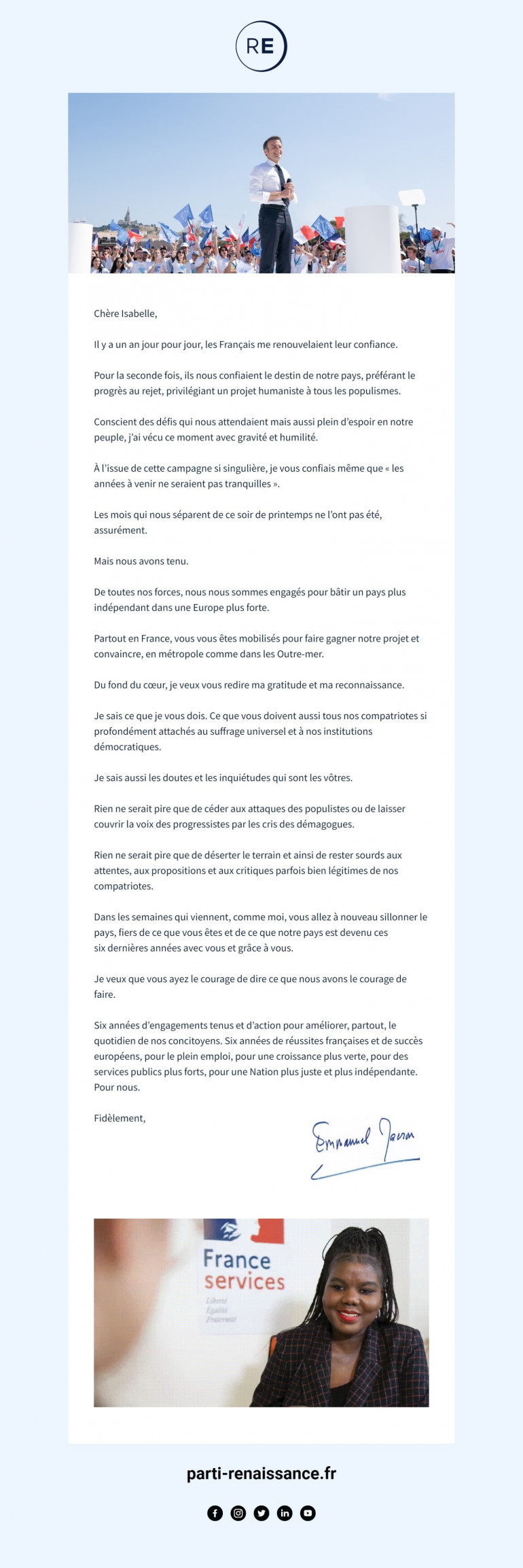 Découvrez ci-dessous la lettre envoyée par Emmanuel Macron aux militants de son parti :