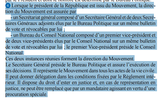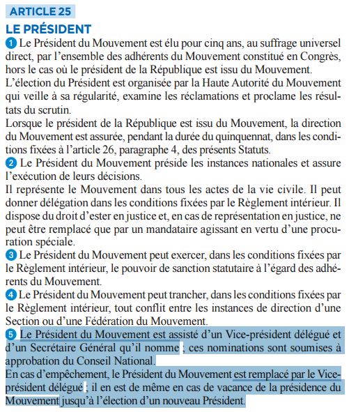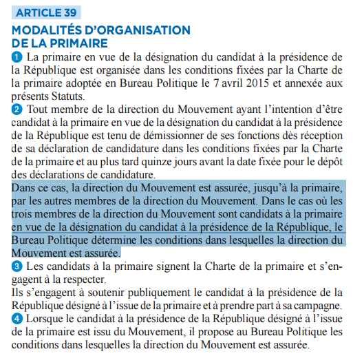 Dans ce cas, "la direction du Mouvement est assurée, jusqu’à la primaire, par les autres membres de la direction du Mouvement. Dans le cas où les trois membres de la direction du Mouvement sont candidats à la primaire en vue de la désignation du candidat à la présidence de la République, le Bureau Politique détermine les conditions dans lesquelles la direction du Mouvement est assurée".