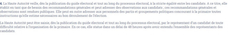En effet, l'ancienne ministre saisit la Haute autorité au titre des articles 1-3 et 10-4 de la charte. Ce dernier stipule que "la Haute autorité peut être saisie, dès la publication du guide électoral et tout au long du processus électoral, par le représentant d’un candidat de toute difficulté relative à l’organisation de la primaire. En ce cas, elle statue dans un délai de 48 heures après avoir entendu l’ensemble des représentants des candidats."