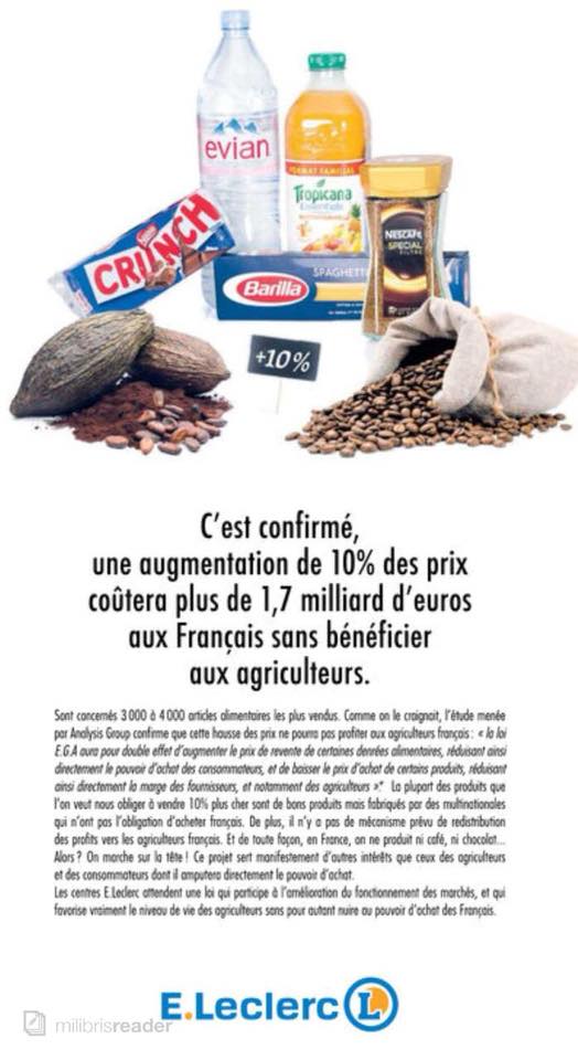 Si cette mesure vise à assurer un meilleur revenu pour les producteurs, elle n'est pas au goût des distributeurs qui se livrent à une guerre des prix, comme Leclerc. Le groupe de Michel-Édouard Leclerc avait début mars décidé de lancer une campagne de communication sur le thème du pouvoir d'achat des Français. "C'est confirmé, une augmentation de 10% des prix coûtera plus de 1,7 milliard d'euros aux Français sans bénéficier aux agriculteurs", peut-on ainsi lire sur les affiches de Leclerc.