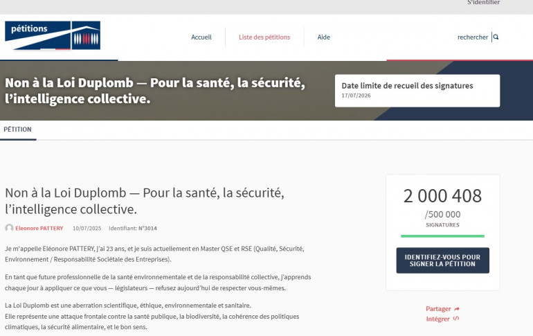 Le cap des 2 millions de signatures de la pétition contre la loi Duplomb a été atteint, ce lundi 28 juillet. Déposée sur le site de l'Assemblée nationale par une étudiante le 10 juillet, elle bat tous les records.