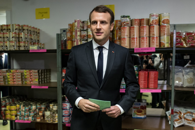 Emmanuel Macron a lancé la 33e campagne hivernale des Restos du Cœur dans le Xe arrondissement de Paris, mardi 21 novembre 2017.