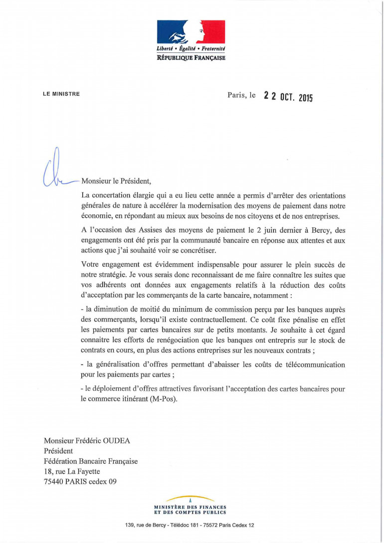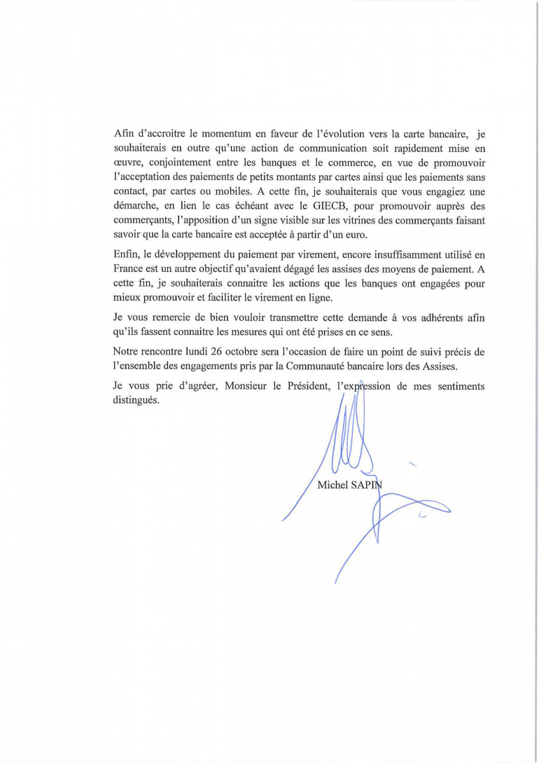Plus précisément, le ministre des Finances, s'interroge sur les engagements relatifs à la réduction des coûts d'acceptation par les commerçants de la carte bancaire. Michel Sapin souhaite qu'une action de communication conjointe soit lancée avec les banques et les commerçants pour promouvoir l'acceptation de la carte bancaire, même pour les petits montants. Le ministre souhaite également connaître les actions engagées par les banques pour mieux promouvoir et faciliter le virement en ligne.
