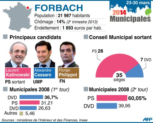 Les candidats à la mairie de Forbach (Moselle) sont : Laurent Kalinowski pour le PS, Alexandre Cassaro pour l’UMP, Florian Philippot pour le FN, Eric Diligent (sans étiquette), exclu de l'UMP.