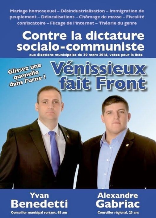 Sur l'affiche de campagne de "Vénissieux fait front" on retrouve des combats aussi hétéroclites que le "mariage homosexuel" la "désinstrualisation" et la "théorie du genre", le tout agrémenté de cette référence douteuse au geste popularisé par Dieudonné.