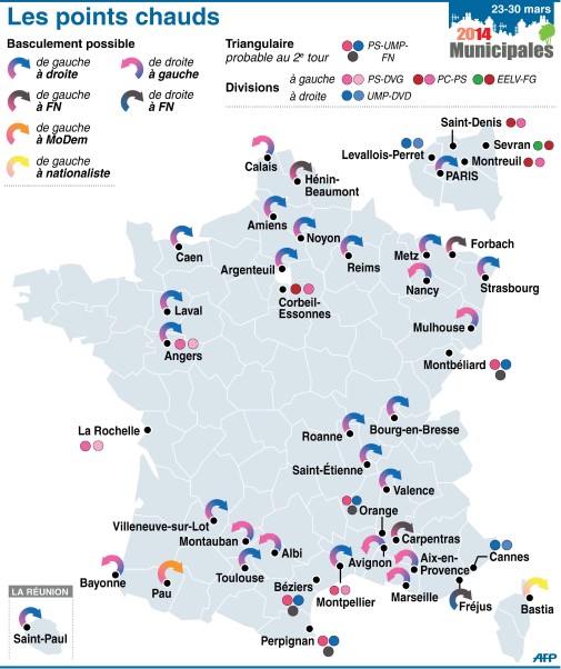 Le Front National a aussi des chances de transformer des mairies à son avantage, comme celles de Forbach, Hénin-Beaumont (pour lesquelles le parti de Marine Le Pen est donné gagnant dans les sondages) ou encore Carpentras. Bastia, quant à elle, pourrait élire un maire nationaliste.