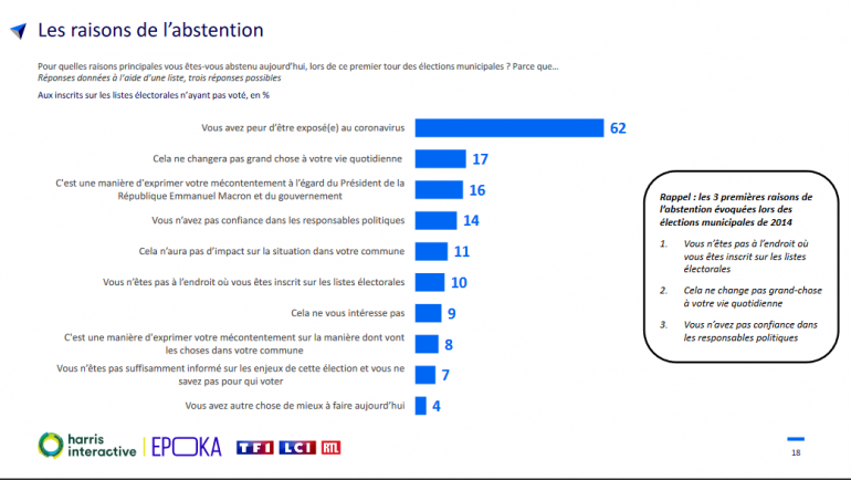 Selon un sondage Harris Interactive/Epoka pour RTL, TF1 et LCI, 62 % des abstentionnistes ne sont pas allés voter de peur d'être exposés au coronavirus.