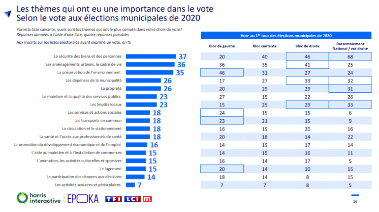 Chez les votants, trois thèmes se sont imposés dans le choix des votants : la sécurité, le cadre de vie et l'environnement. La sécurité a notamment joué chez les électeurs d'extrême-droite (68 %), de droite (46 %) et du centre (40 %). Chez les électeurs de gauche, c'est clairement l'environnement qui s'impose (46 %).