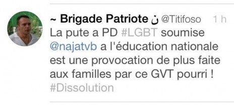 Un tweet qu'il supprimera mais qui lui vaudra de nombreuses critiques de la part des internautes et un titre de "macho de l'année" décerné par l'association féministe les Chiennes de garde. L'élu évoque, lui, "un tweet maladroit". Une défense que ne peut pas adopter Jean-Marc Buccafurri, candidat FN lors des départementales. Ce dernier qualifie Najat Vallaud-Belkacem de "pute à PD LGBT".