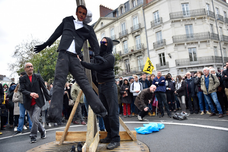Le 7 avril, au début d'un défilé qui avait rassemblé étudiants et cheminots, un groupe de manifestants avait organisé un faux procès sur une place de Nantes, puis pendu un mannequin à l'effigie du chef de l'État à une potence en bois, avant d'y mettre le feu.