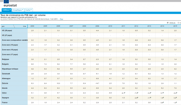 En 2013, soit après l'investiture de François Hollande le 21 juin 2012, la France a enregistré une croissance de 0,6%. Celle de l'Union européenne était de 0,2%. Cette année, le PIB de la France était donc plus élevé que celui de l'Union européenne. En 2014, la tendance s'inverse avec un taux de croissance en France de 0,6 contre 1,4% pour l'Europe. L'année suivante, la France a enregistré une croissance de 1,3% contre 2% pour l'Union européenne, comme le montrent les chiffres publiés par Eurostat. À noter qu'en 2012, la France avait réalisé une croissance de 0,2% alors que l'Europe a encaissé une baisse de 0,5%.
