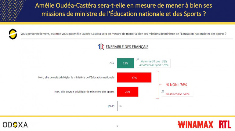 Depuis 2022, l’action aux Sports de l'ancienne joueuse de tennis (45 ans) était jugée positive par une majorité de Françaises et de Français concernant la lutte contre les violences sexuelles et sexistes (53%), le soutien au sport et aux sportifs français (53%) et même la préparation des JO de Paris (51%). Enfin, David Douillet (43%), Bernard Laporte (24%) et Guy Drut (21%), ont été les meilleurs ministres des Sports des 30 dernières années.