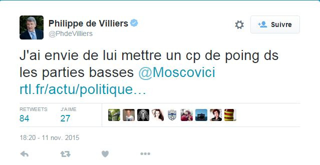 Une sortie qui révolte Philippe de Villiers. Sur son compte Twitter, l'ancien député européen et candidat à l'élection présidentielle s'est montré très virulent à l'encontre de Pierre Moscovici, ce mercredi 11 novembre. "J'ai envie de lui mettre un coup de poing dans les parties basses", a-t-il écrit en relayant le papier publié sur RTL.fr.