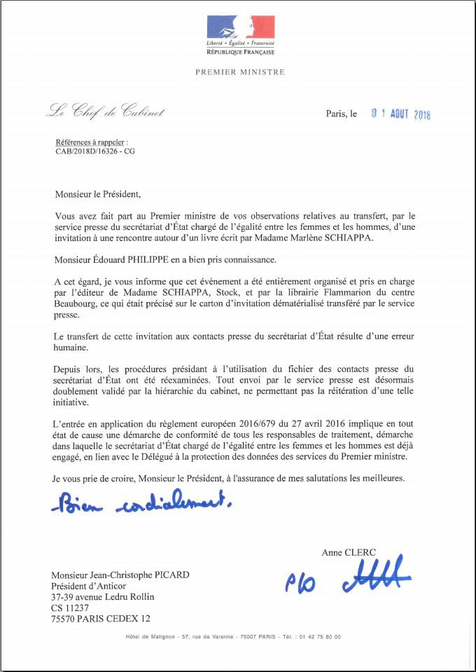 La lettre précise que depuis cet incident, "tout envoi par le service de presse est doublement validé par la hiérarchie du cabinet".