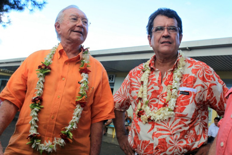 Gaston Flosse (à gauche) et Édouard Fritch à Papeete le 5 mai 2013.