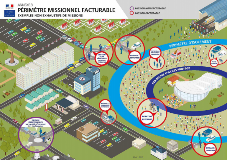 Mais comment cela va-t-il s'appliquer ? Le ministère de l'Intérieur a réalisé une infographie dans laquelle on voit tous les types de missions pouvant être réalisées par les forces de l'ordre lors d'un festival. Il y est précisé celles qui devront être remboursées à l'État. Par exemple, la gestion du flux de véhicules, les barrages et déviations et les points de filtrage seront désormais à la charge des organisateurs. Cela vient donc s'ajouter aux services de sécurité privée déjà embauchés par les organisateurs.