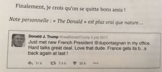 Pour rendre son récit encore plus ancré dans la réalité, il a inséré un faux tweet de Donald Trump que le président américain aurait publié à l'issue de leur rencontre. Et visiblement les arguments de Nicolas Dupont-Aignan n'ont pas laissé indifférent son homologue Outre-Atlantique. "Je viens juste de m'entretenir dans mon bureau avec le nouveau président français Dupont-Aignan. Discussions franches, bon accord. J'adore ce mec. La France retrouve enfin ses c******s!".