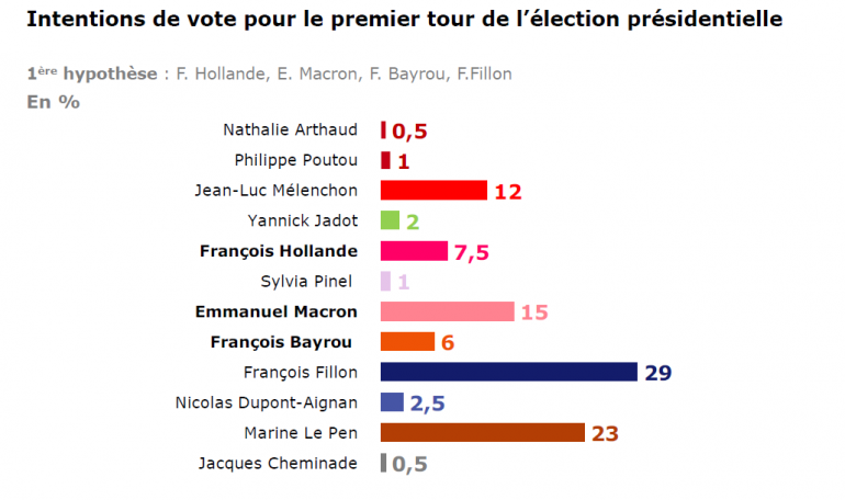 Selon un sondage RTL, Le Figaro, LCI, François Fillon serait en tête au premier tour, quel que soit le scénario. Si François Hollande se présente à l'élection présidentielle, le député de Paris recueillerait 29% des intentions de vote, contre 23% pour Marine Le Pen, 15% pour Emmanuel Macron, 12% pour Jean-Luc Mélenchon, 7,5% pour le président sortant et 6% pour François Bayrou. L'étude démontre que l'électorat le plus sensible à la fibre Fillon est à 44% âgé de plus de 65 ans.