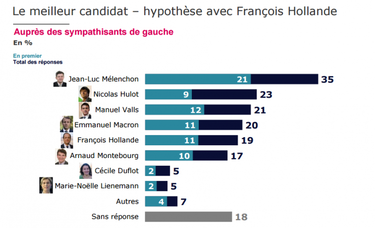 Auprès des sympathisant de gauche en général, corps qui serait le plus amené à participer à une éventuelle primaire ouverte, le score du président est plus inquiétant. Jean-Luc Mélenchon arrive largement en tête en étant le premier choix de 21% du panel. François Hollande avec 11% est au coude-à-coude avec Manuel Valls (12 points), Emmanuel Macron (11 points) et Arnaud Montebourg (10 points). L'analyse plus large renforce la place de Jean-Luc Mélenchon en tête du classement (35% du total des réponses) suivi de Nicolas Hulot (23%), Manuel Valls (21%) et Manuel Macron (20%). L'actuel locataire de l'Élysée n'arrive que bon 5ème avec 19%.