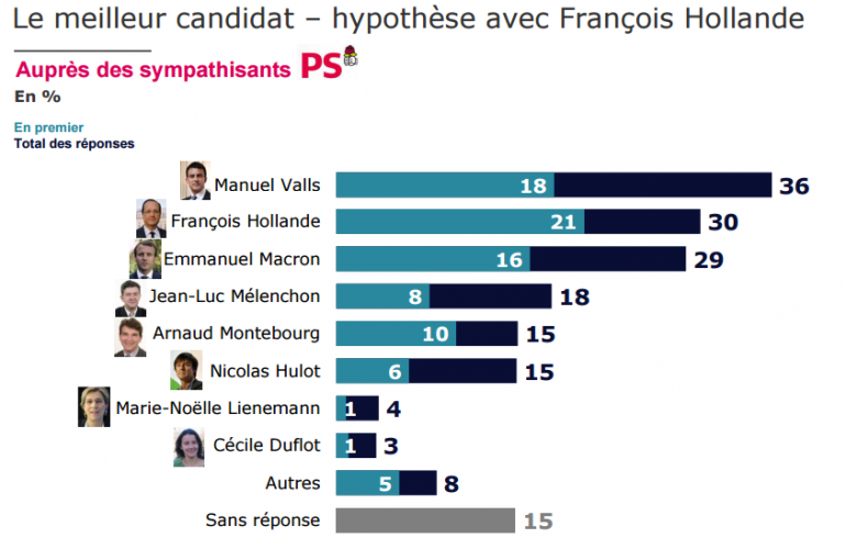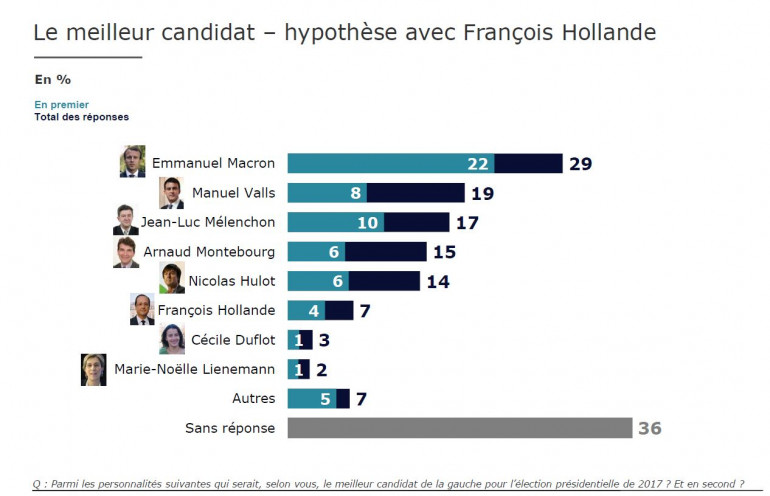Mais c'est auprès d'un échantillon représentant les Français en général que le désamour pour François Hollande est le plus palpable. Le classement TNS Sofres-One Point classe Emmanuel Macron largement en tête des personnalités préférées des Français pour mener la gauche en 2017. Manuel Valls, Jean-Luc Mélenchon, Arnaud Montebourg et Nicolas Hulot maintiennent des scores louables entre 19 et 14 points). François Hollande est quant à lui extrêmement bas (4% des Français le considère comme le meilleur candidat de la gauche en premier choix, 7% au total). Un score plus proche de celui d'une candidature Duflot voire Lienemann.