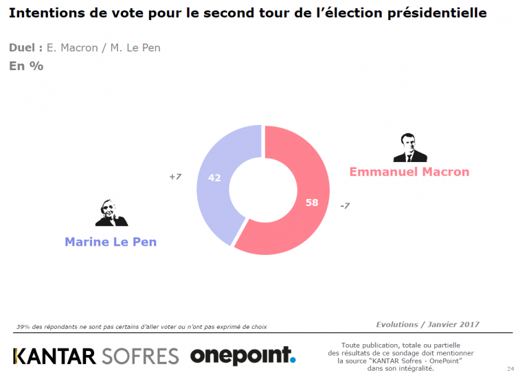 Le candidat "En Marche!" deviendrait président avec 58% des voix, contre 42% pour la candidate frontiste : c'est un recul de 7 points en un mois. Les déclarations de l'ancien ministre de l'Économie sur la colonisation ont peut-être ici leur effet, puisque le report en sa faveur des électeurs de François Fillon du premier tour recule. S'il atteignait le second tour face à Marine Le Pen, le candidat de la droite et du centre ne remporterait la présidentielle qu'avec 55% des voix, contre 45% pour Marine Le Pen. Un résultat en recul de 5 points.