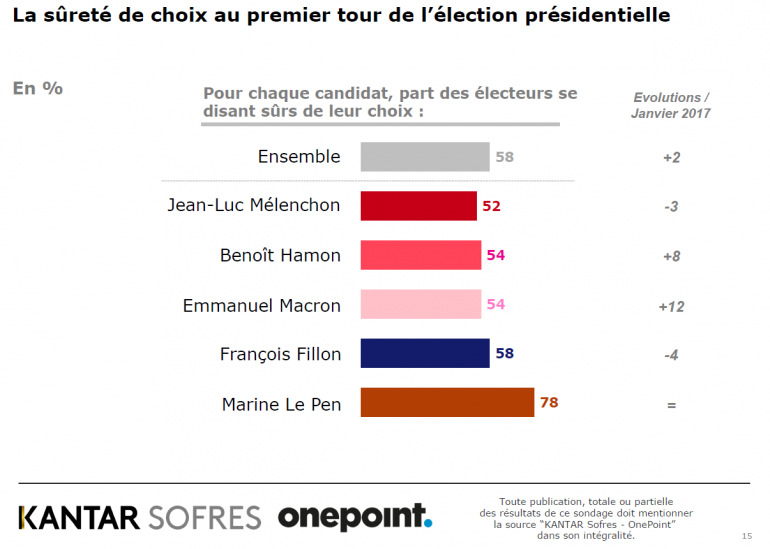 Non seulement, Emmanuel Macron engrange des points dans les intentions de vote, mais sa candidature convainc de plus en plus les Français. La part de ses électeurs qui se disent sûrs de leur choix progresse de 12 points par rapport au mois dernier : 54% aujourd'hui contre 42% lors de la dernière vague, soit le même niveau de certitude que celui observé chez les électeurs de Jean-Luc Mélenchon, Benoît Hamon et François Fillon.