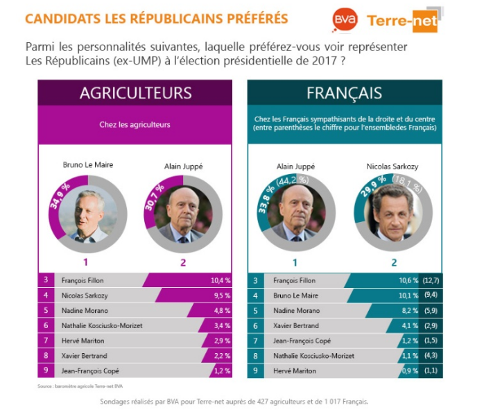 Dans un sondage BVA pour Terre-net datant de novembre 2015 (voir ci-dessus) c'est l'ancien ministre de l'Agriculture, Bruno Le Maire, lui aussi chiraquien, qui est pourtant en tête des intentions de vote chez les agriculteurs. Il est le candidat préféré de 34,9% des sondés contre 30,7% pour Alain Juppé, qui reste toutefois largement devant ses poursuivants, François Fillon (10,4%) et Nicolas Sarkozy (9,5%).