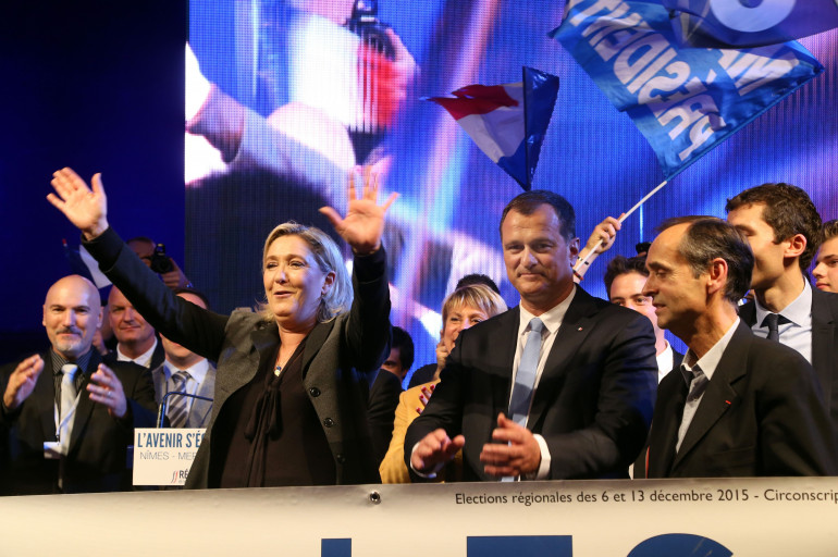 Marine Le Pen, Louis Aliot et Robert Ménard (de gauche à droite) le 2 décembre 2015 à Nîmes.