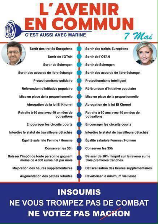 Dans la même veine, un tract circule massivement sur les réseaux sociaux depuis le 24 avril, et notamment sur des groupes de soutien à la candidate frontiste, pour vanter les 16 points communs entre le programme de la France insoumise et celui du Front national. Ce tract reprend parfaitement les codes visuels de la France insoumise, mixés à ceux du FN.