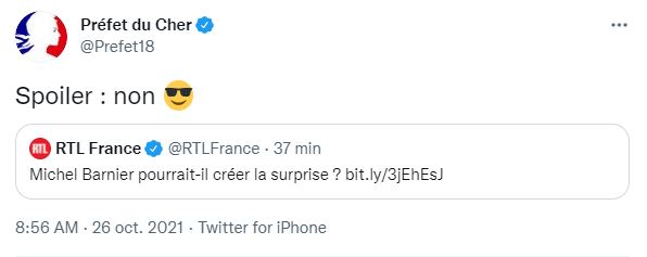 Qui l'emportera ? C'est là que le préfet du Cher entre en scène. Sur son compte Twitter officiel, il semble surtout avoir une idée de qui ne l'emportera pas : Michel Barnier. En réaction à un article de RTL s'interrogeant sur la présence ou non d'une dynamique favorable à Michel Barnier parmi les militants Les Républicains, il a laissé transparaitre son avis.