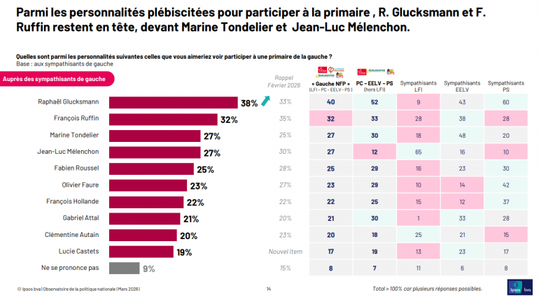 Mais la polarisation est forte : seuls 2% des proches de LFI accepteraient Glucksmann, tandis que 11% des sympathisants PS envisageraient Mélenchon. François Ruffin apparaît comme une option moins clivante, citée par 21% des sympathisants de gauche, sans toutefois faire consensus.