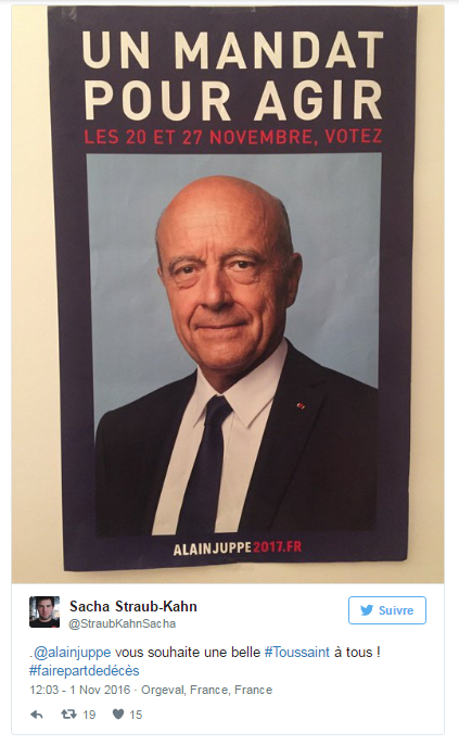 Cette image, un peu vieillotte, a été raillée par le community manager de Nicolas Sarkozy, Sacha Straub-Kahn. Ce dernier a posté un tweet dans lequel il a tenté une blague douteuse : "Alain Juppé vous souhaite une belle Toussaint à tous". Sacha Straub-Kahn, joint par le Huffington Post, a indiqué qu'il ne "comprend pas" les réactions négatives à cette plaisanterie. "Chacun est libre de son interprétation. Ce tweet n'engage que moi". Depuis cette interview, le community manager de Nicolas Sarkozy a néanmoins décidé de supprimer son tweet.