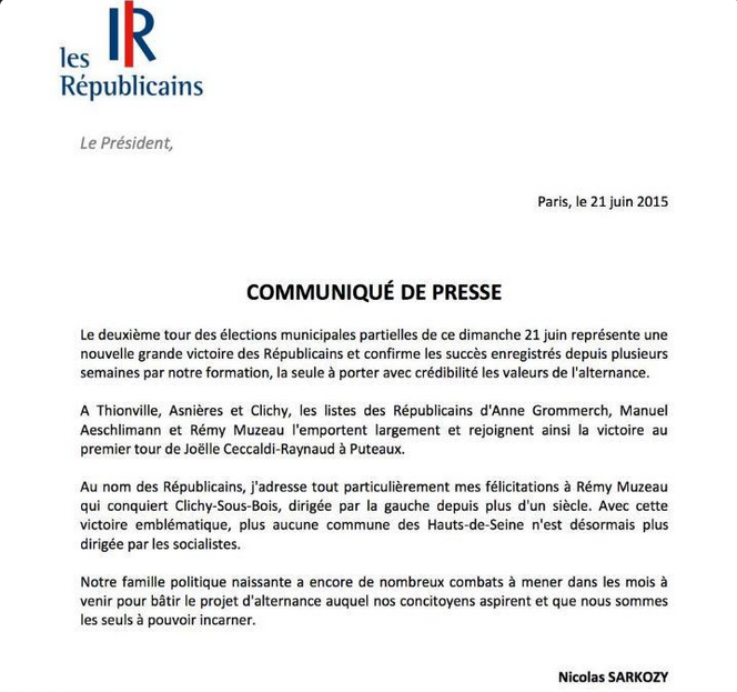 Nicolas Sarkozy a-t-il été un peu trop pressé de fêter la victoire de son parti aux municipales partielles d'Asnières et de Clichy-la-Garenne ? Dans un communiqué qu'il signe, il a tout du moins laissé passer une belle coquille, voire deux. "Au nom des Républicains, j'adresse tout particulièrement mes félicitations à Rémy (sic) Muzeau qui conquiert Clichy-sous-Bois, dirigée par la gauche depuis plus d'un siècle."